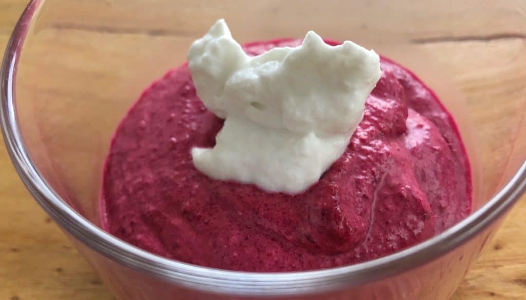 30 minutos antes de servir, mezclad la crema batida con la mezcla de remolacha, y removed con suavidad. Luego, dejad reposar la mezcla final en el congelador durante 30 minutos.