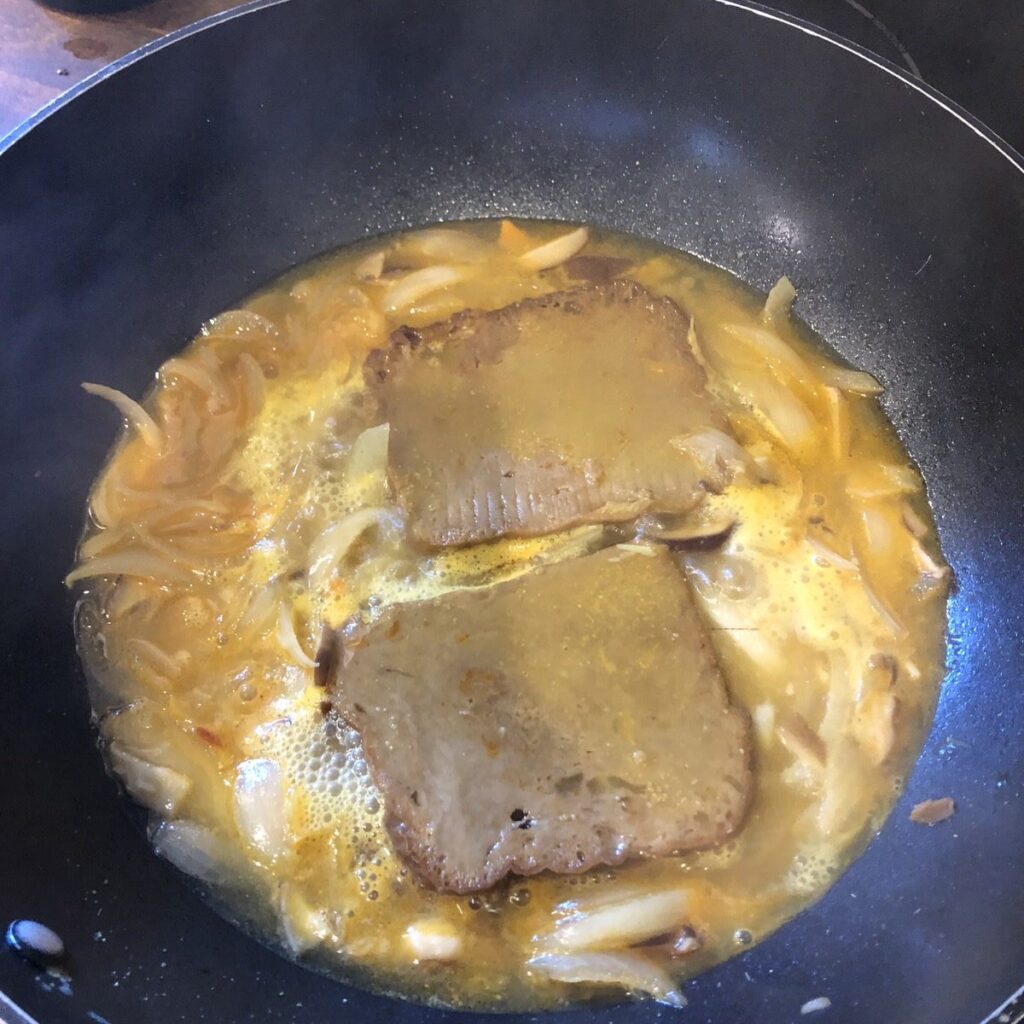 Retirad y reservad a parte los filetes de seitán. Seguid cociendo lo que queda en el wok a fuego lento durante 15 minutos, teniendo cuidado de que no se seque demasiado (no dudéis en agregar algunas cucharadas de agua si observáis que comienza a secarse demasiado).