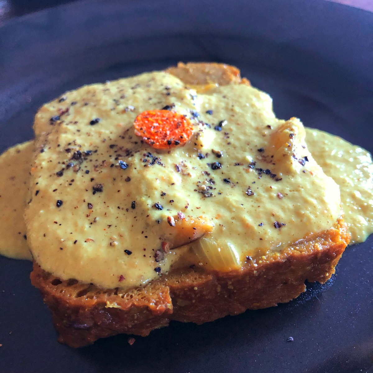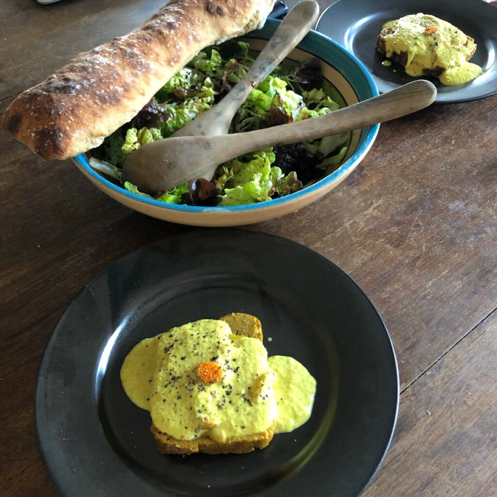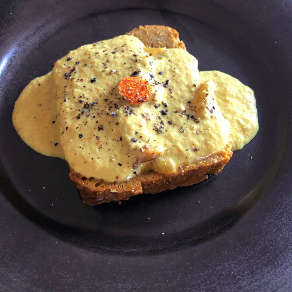 Colocad cada filete de seitán en un plato, añadidle la salsa y decorad con las rodajas de cúrcuma que habíais reservado. También podéis ponerle unas rodajas finas de ajo negro o de trufa.