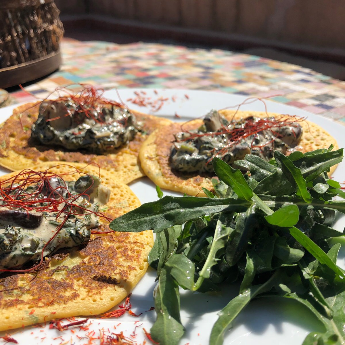 La socca se puede acompañar con lo que más os guste. Para esta receta, yo he optado por un acompañamiento de vegetales frescos del huerto, hongos shiitake, crema de soja, polvo de tamarindo y distintas variedades de pimienta.